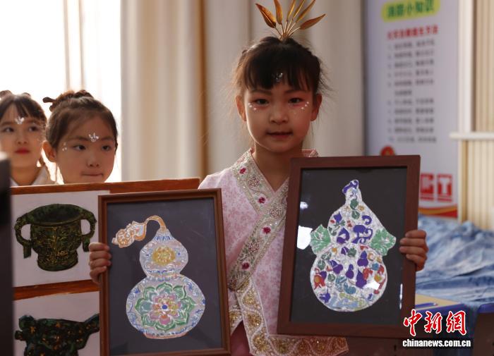 图为银川市金凤区第108小教教死为线上其余黉舍师死显现掐丝绘着作。中新社记者 于晶 摄
